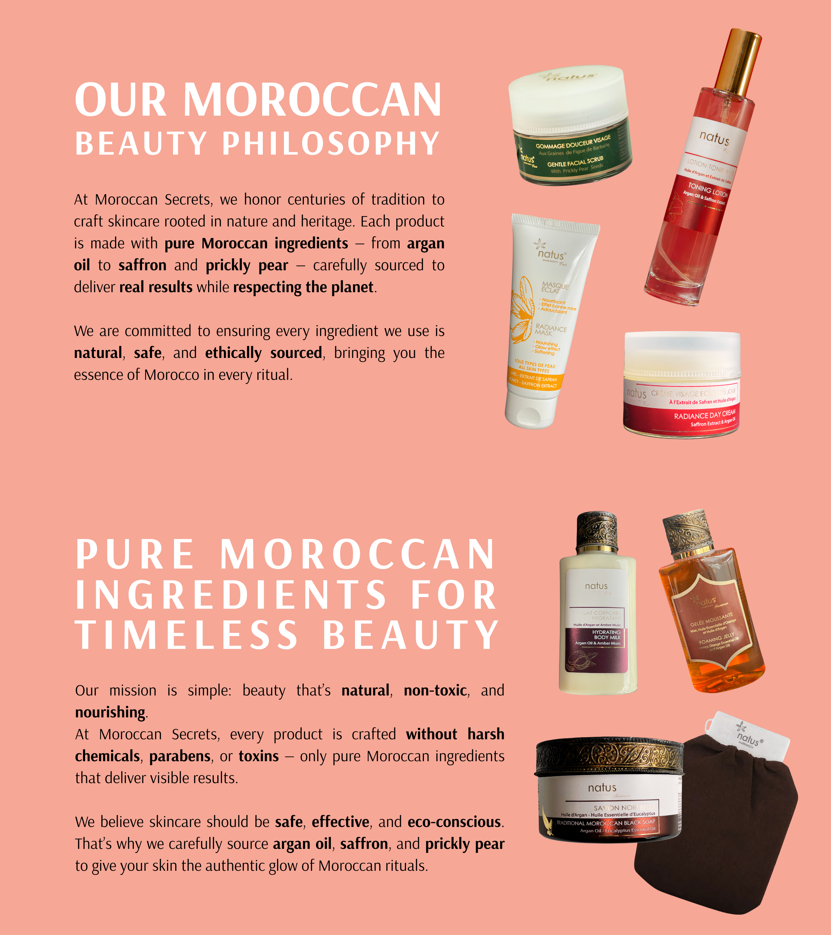Our goal is simple: to share the nourishing, chemical-free skincare secrets of Morocco through ethical, effective, and affordable products.